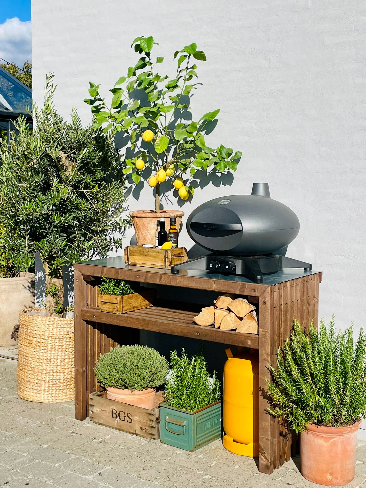 Om produktet Lækkert grillbord af traller, der kan bruges som afsætningsbord i udekøkkenet eller til placering af en gasgrill på bordet. Hylden under bordet giver praktisk opbevaringsplads når man griller. Der er plads til en 11kg gasflaske under hylden.